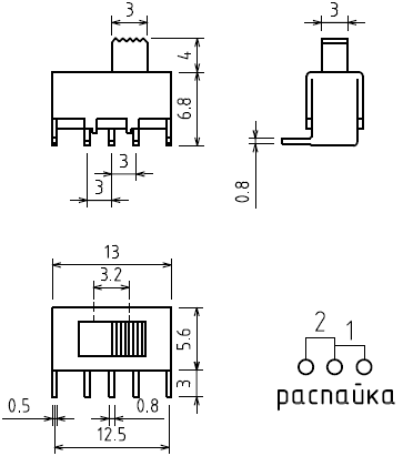 Движковый переключатель мини 3 контакта, угловой, тип 8