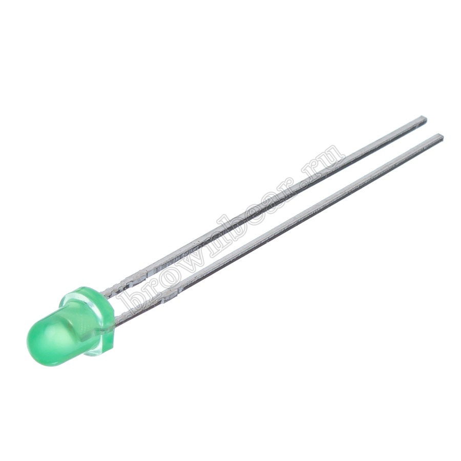 Зелёный светодиод слаботочный, с круглой линзой Ø 3 мм, с максимальной яркостью 2.2 mcd устанавливается на плату с помощью пайки, используется для световой индикации в различных устройствах.