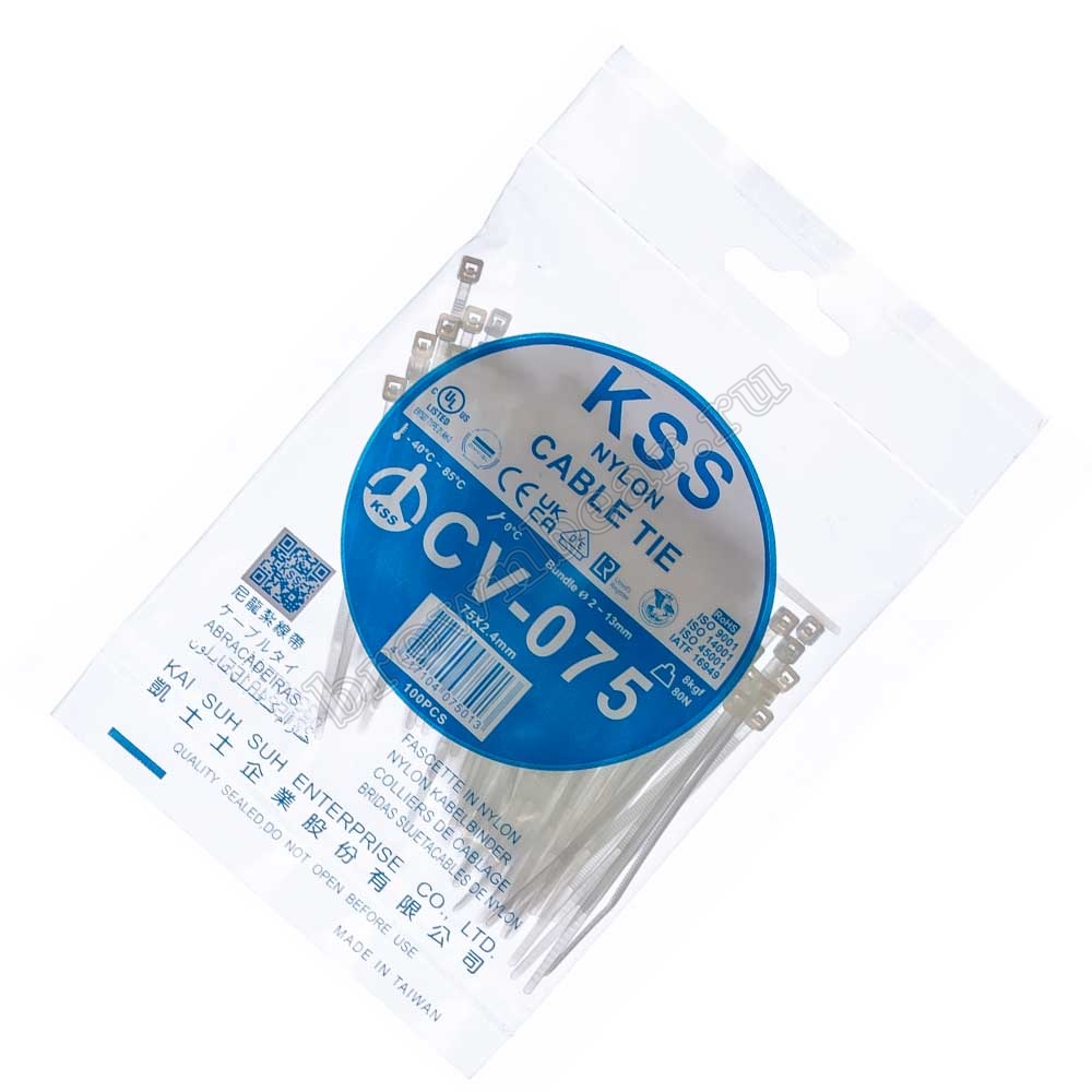 Стяжки (хомуты) KSS произведены из нейлона 66, класса пожаробезопасности UL94 V-2, малодымные, не содержат галогенов, обладают отличными механическими характеристиками, прочностью, высокой износостойкостью, выдерживают широкий диапазон температур, подходят для различных отраслей промышленности, а также для домашнего использования.